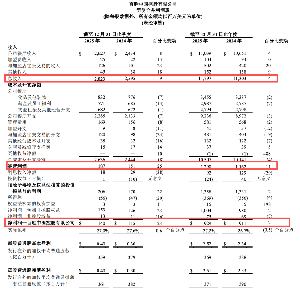 2025年全年,百胜中国总收入同比增长4%至117.97亿美元;经营利润达12.9亿美元,同比增长11%;归母净利润为9.29亿美元,同比增长2%。